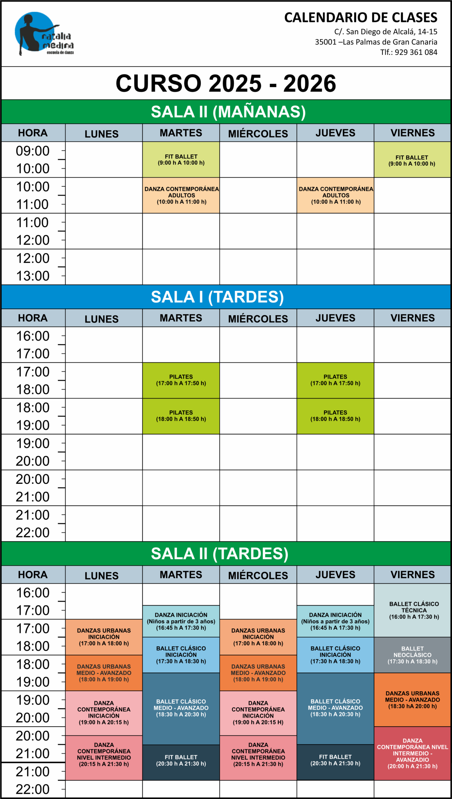 | Todos los niveles | Martes y Viernes 9:00 h – 10:00 h |